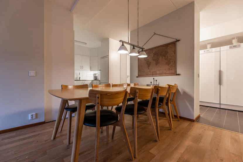 Køkkenet indeholder: keramiske kogeplader med ovn, køleskab, frys, opvaskemaskine, microovn.