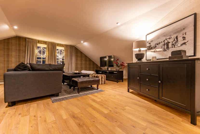 HC Ski Lodge ligger i Högfjället. Lejlighed i 2 etager, 8+1 sengepladser, 165 m², alrum med køkkenafdeling, 5 soveværelser, 2 brusere, 2 WC, sauna.