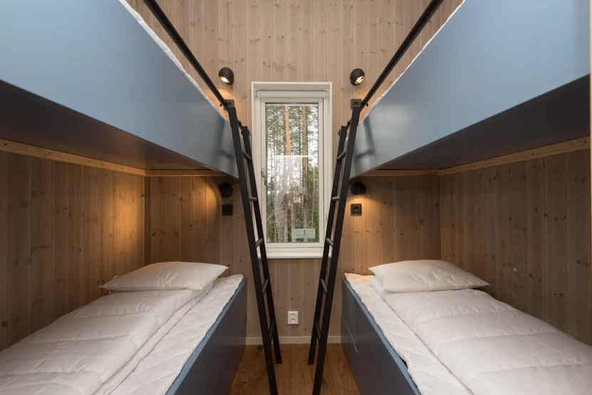 Soveværelse-1= 1 dobbeltseng 160 cm bred. Soveværelse-2= 2 køjesenge 80 cm bred.