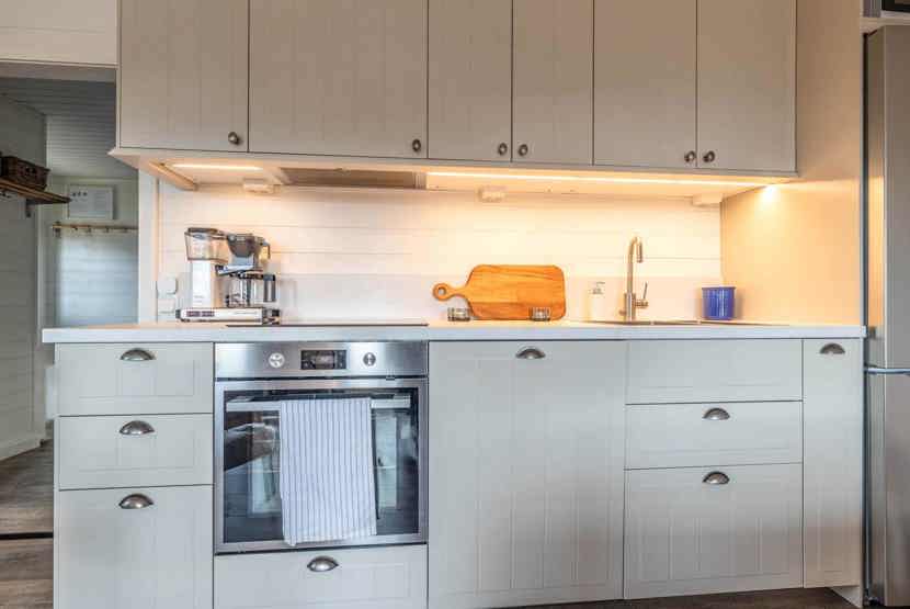 Køkkenet indeholder: elkomfur med ovn, køleskab, frys, opvaskemaskine, microovn.