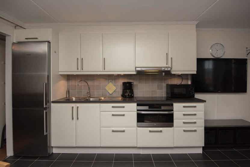 Køkken: indeholder: keramiske kogeplader, Komfur med ovn og mikroovn, frys, køleskab, spisebordet er et barbord med tilhørende høje stole.