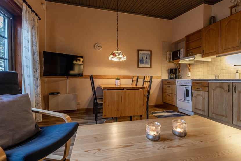 Opholdsstue med køkkenafdeling. TV, tørreskab, rum til skiudstyr, balkon.