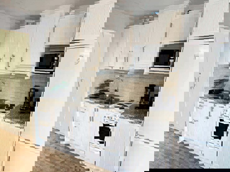 Køkkenet indeholder: elkomfur med ovn, køleskab, frys, microovn.