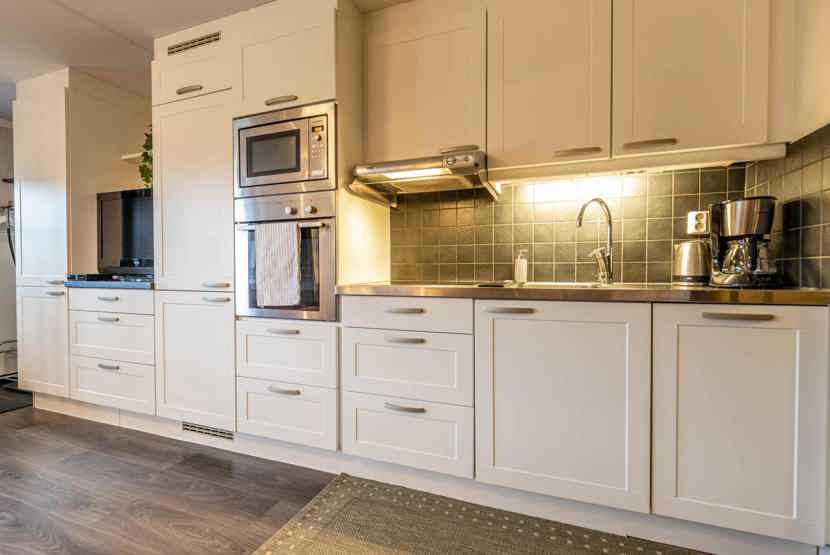 Køkken: indeholder: elkomfur med ovn, køleskab, frys, opvaskemaskine, microovn.