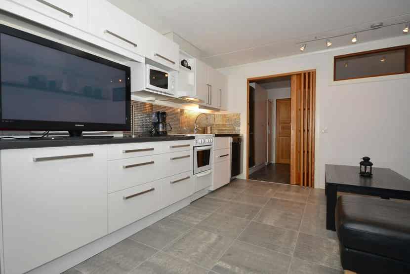 Køkkenet indeholder: elkomfur med ovn, køleskab, frys, opvaskemaskine, microovn.