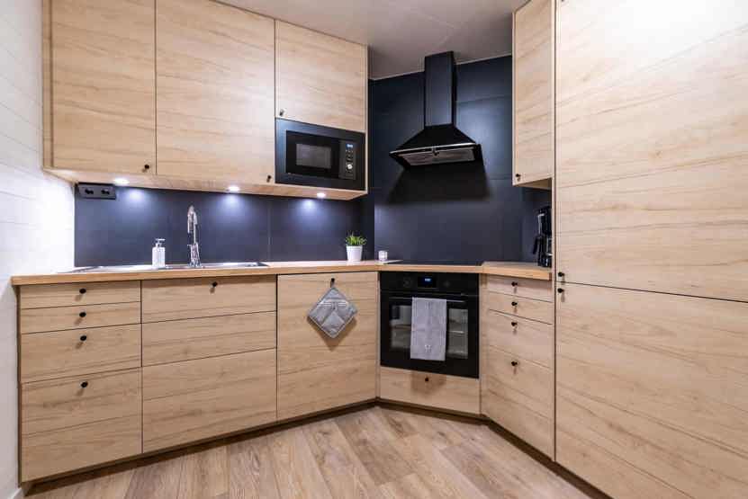 Køkkenet indeholder: elkomfur med ovn, køleskab, frys, opvaskemaskine, microovn.