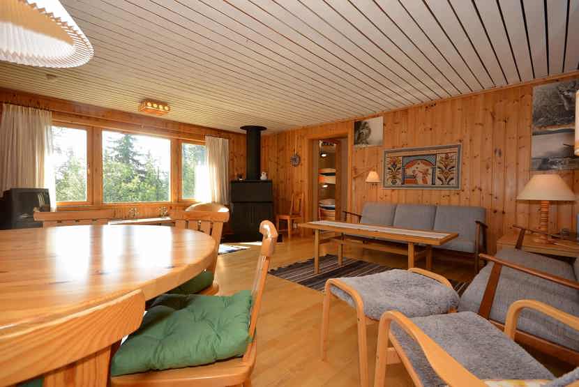 Opholdsstue med køkkenafdeling. TV, brændeovn (brænde indgår ikke), 1 højstol, 1 barneseng, rum til skiudstyr.