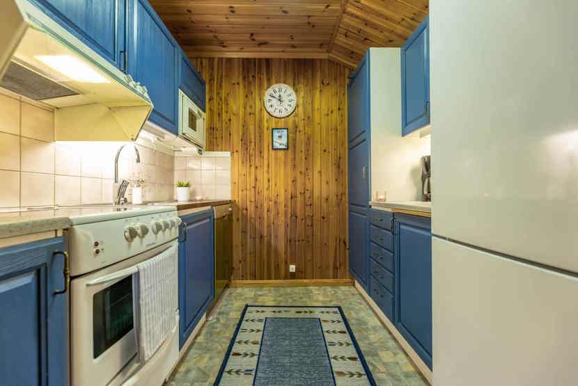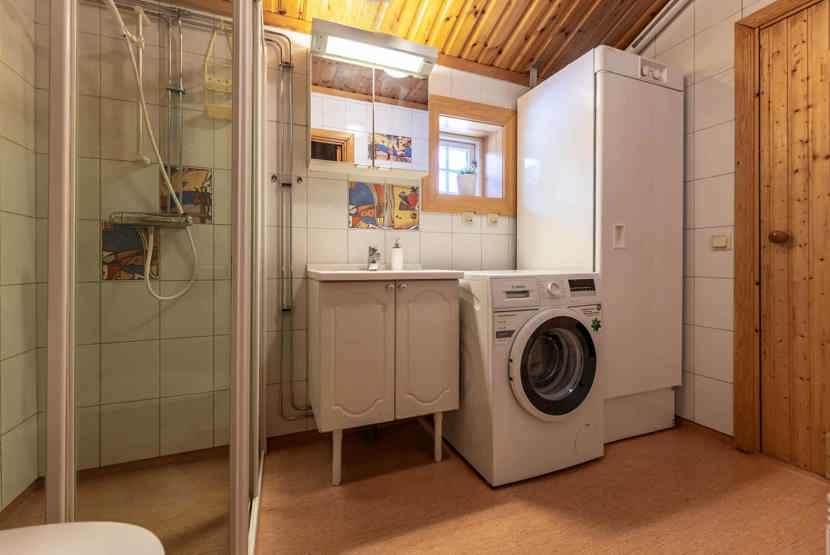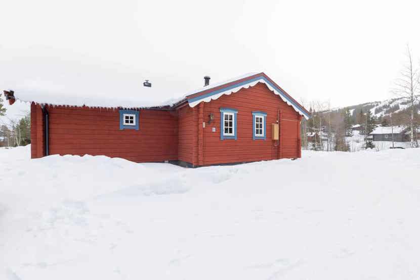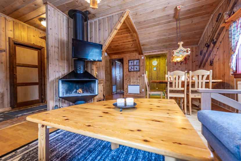 Opholdsstue med køkkenafdeling. TV, brændeovn (brænde indgår ikke), vaskemaskine, tørreskab, rum til skiudstyr.
