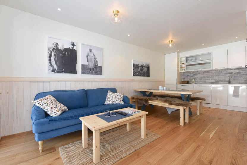 Opholdsstue med køkkenafdeling. TV, rum til skiudstyr.