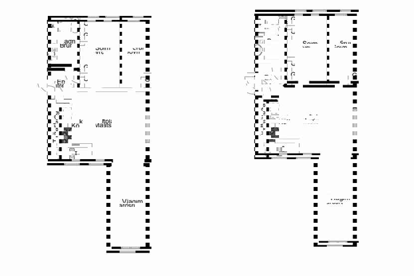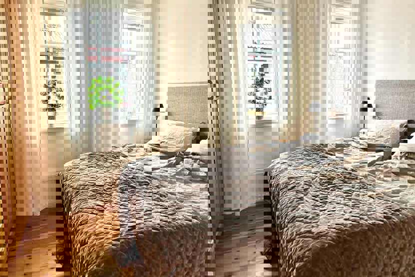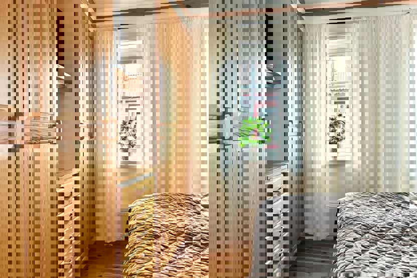 Soveværelse-1= 1 dobbeltseng 160 cm bred. Soveværelse-2= 2 køjesenge hvor både over og underkøje er 80 cm bred.