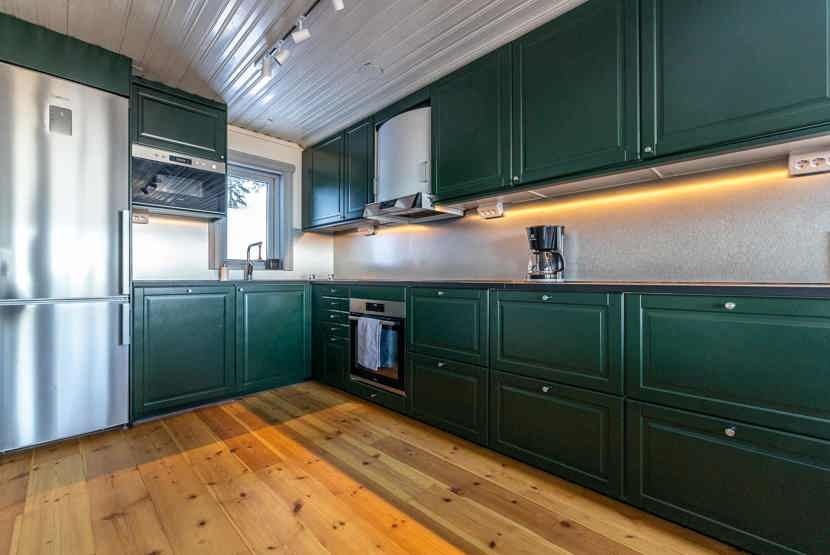 Køkkenet indeholder: elkomfur med ovn, køleskab, frys, opvaskemaskine, microovn.