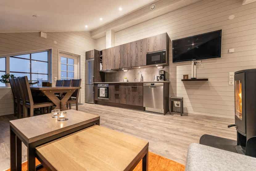 TV, brændeovn (brænde indgår ikke), vaskemaskine, tørretumbler, tørreskab, balkon, udtag til motorvarmer til bilen forefindes. Kræver specielt stik i bilen, rum til skiudstyr.