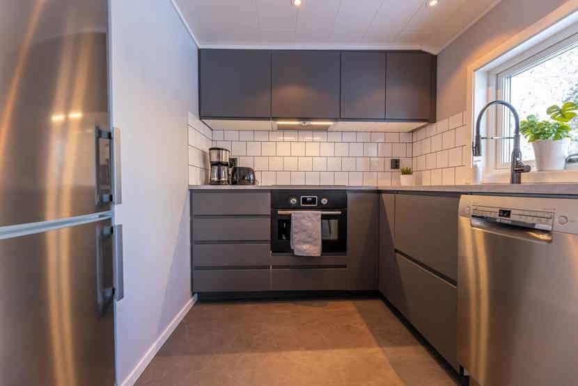 Køkkenet indeholder: kogeplade, kombiugn med microovn, køleskab, frys, opvaskemaskine.