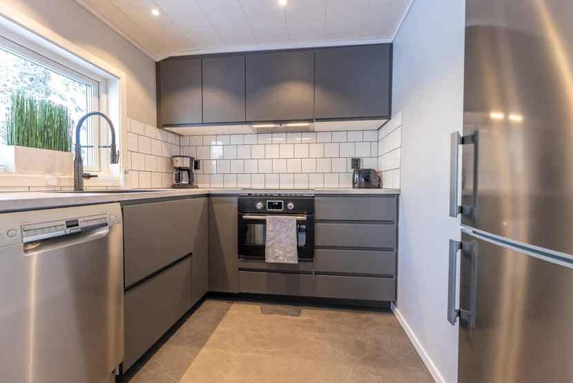 Køkkenet indeholder: kogeplade, kombiugn med microovn, køleskab, frys, opvaskemaskine.