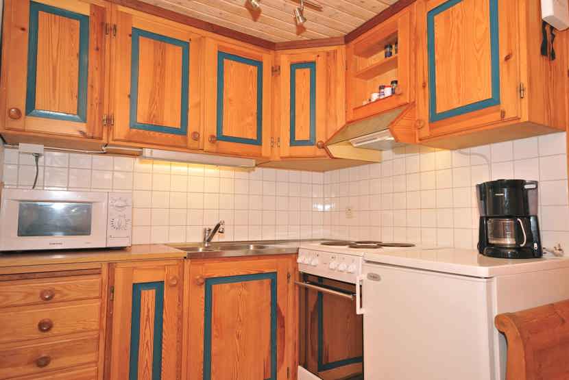 Køkkenet indeholder: elkomfur med ovn, køleskab, frys, microovn.