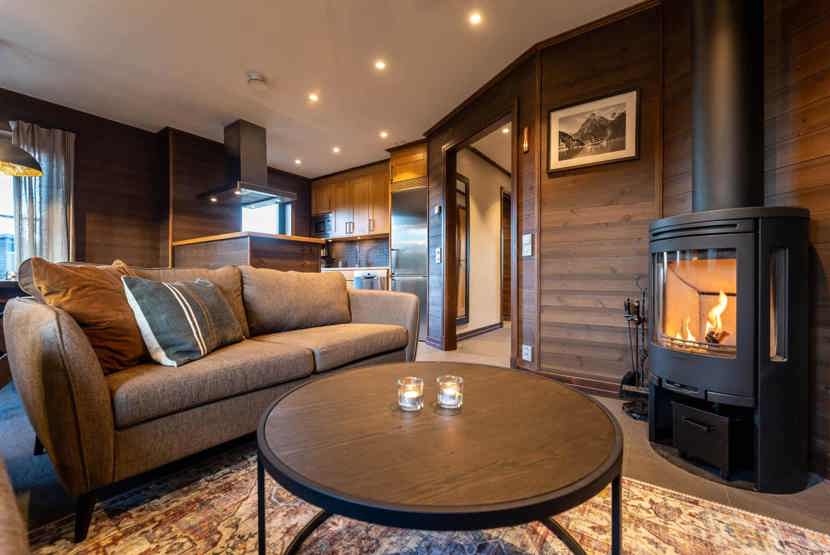 Opholdsstue med køkkenafdeling. TV, brændeovn (brænde indgår ikke), tørreskab, vaskemaskine, rum til skiudstyr.