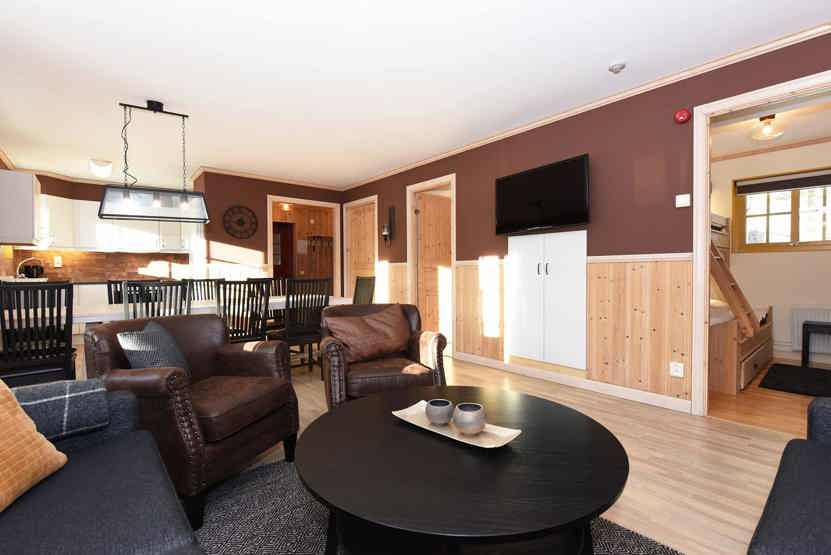 Opholdsstue med køkkenafdeling. TV, tørreskab, rum til skiudstyr.