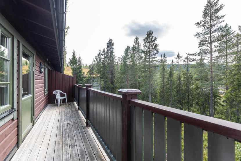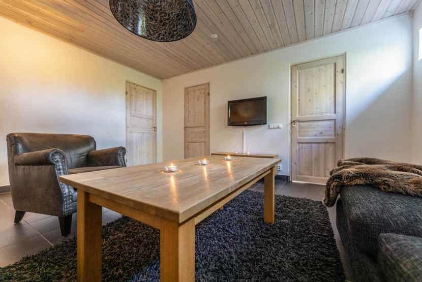 Opholdsstue med køkkenafdeling, og opholdsstue på nedre etage. TV, brændeovn (brænde indgår ikke), tørreskab, balkon.