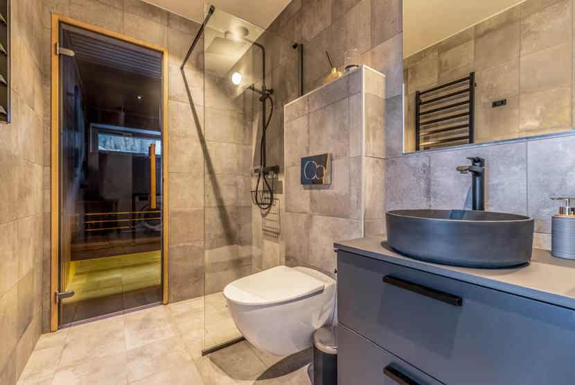 Badeværelset-1 = bruse/wc/sauna. Badeværelset-2 = bruse/wc.
