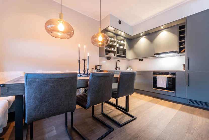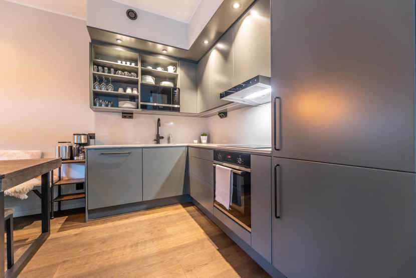 Køkkenet indeholder: keramiske kogeplader med ovn, køleskab, frys, opvaskemaskine, microovn.