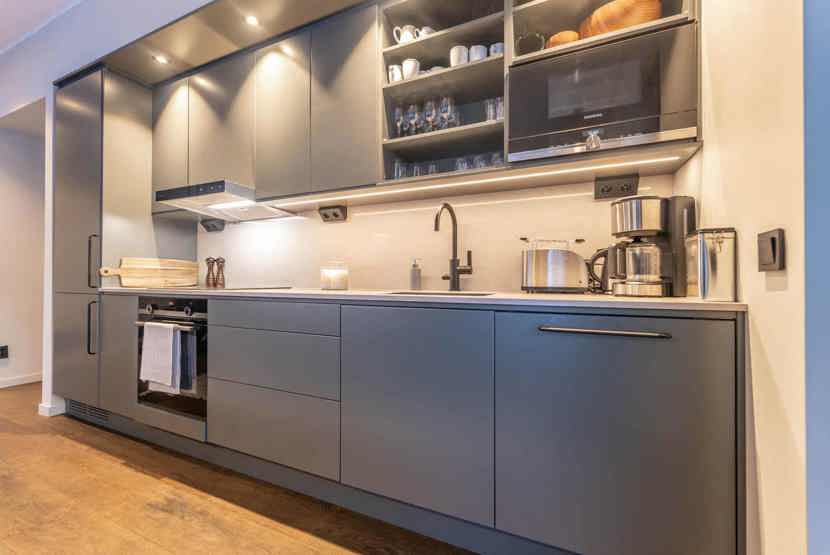 Køkkenet indeholder: keramiske kogeplader med ovn, køleskab, frys, opvaskemaskine, microovn.