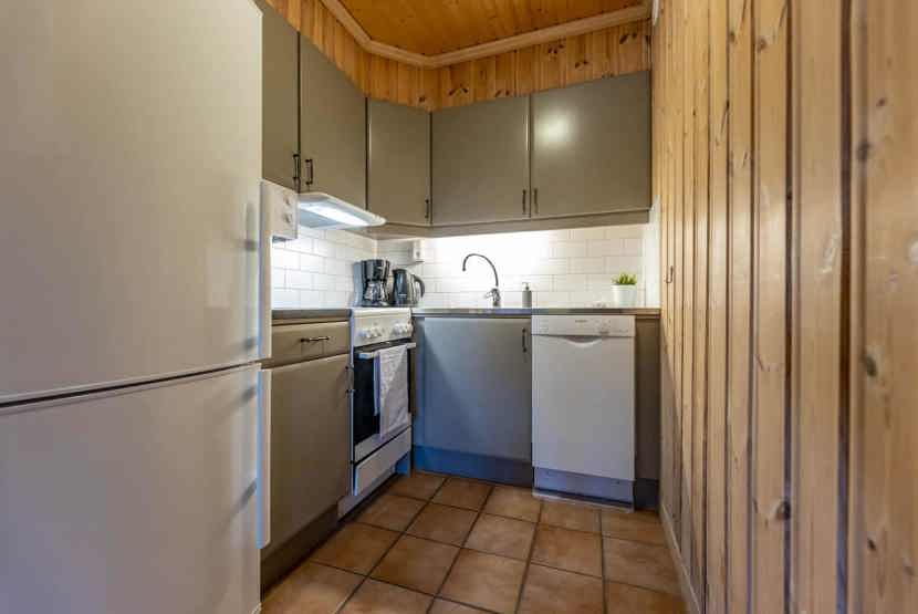 Opholdsstue med køkkenafdeling. TV, tørreskab, rum til skiudstyr, 1 barneseng, 1 højstol.