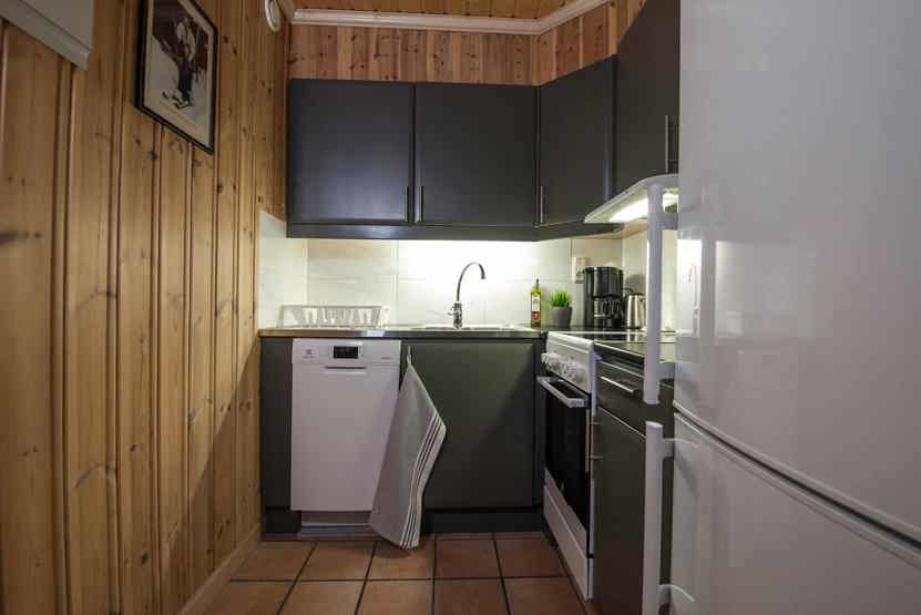 Opholdsstue med køkkenafdeling. TV, tørreskab, rum til skiudstyr, 1 barneseng, 1 højstol.