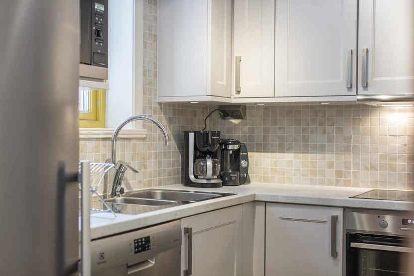 Køkkenet indeholder: elkomfur med ovn, microovn, opvaskemaskine, køleskab, frys.