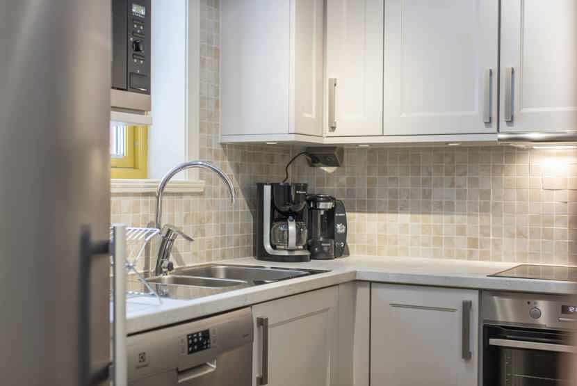 Køkkenet indeholder: elkomfur med ovn, microovn, opvaskemaskine, køleskab, frys.