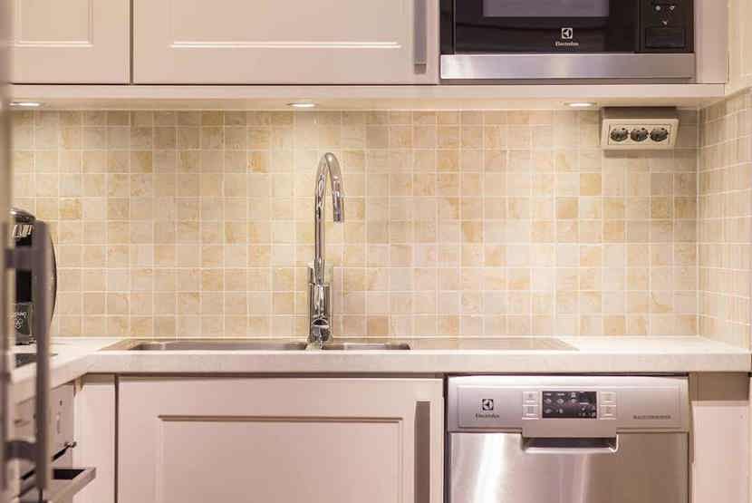 Køkkenet indeholder: elkomfur med ovn, microovn, opvaskemaskine, køleskab, frys.