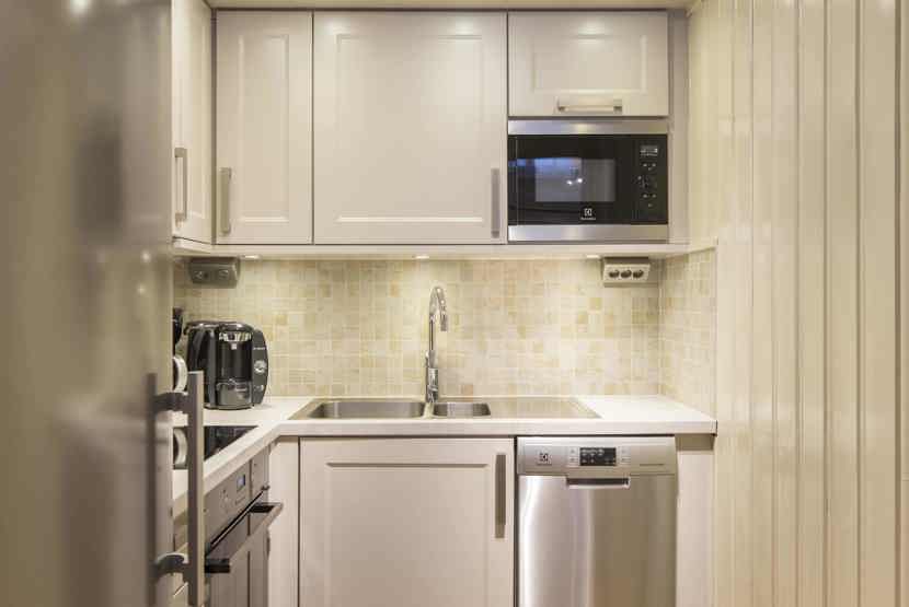 Køkkenet indeholder: elkomfur med ovn, microovn, opvaskemaskine, køleskab, frys.