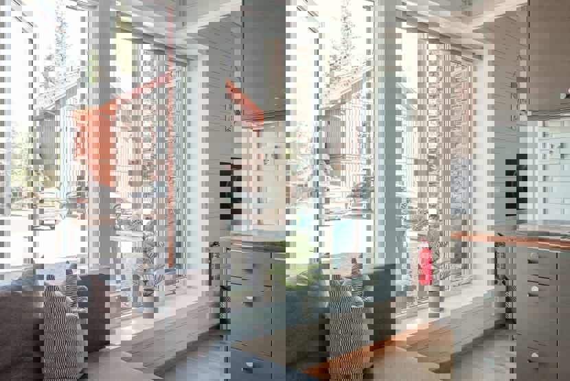 Køkkenet indeholder: keramiske kogeplader, kombiugn med microovn, køleskab, frys, opvaskemaskine.