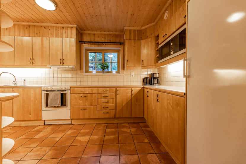 Køkkenet indeholder: elkomfur med ovn, microovn, opvaskemaskine, køleskab, frys.
