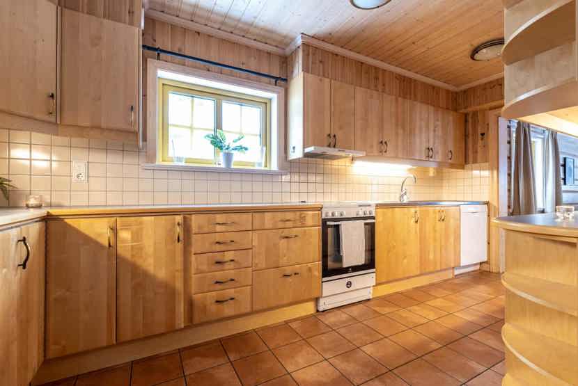 Køkkenet indeholder: elkomfur med ovn, microovn, opvaskemaskine, køleskab, frys.