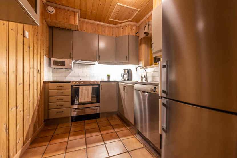 Køkkenet indeholder: elkomfur med ovn, microovn, opvaskemaskine, køleskab, frys.