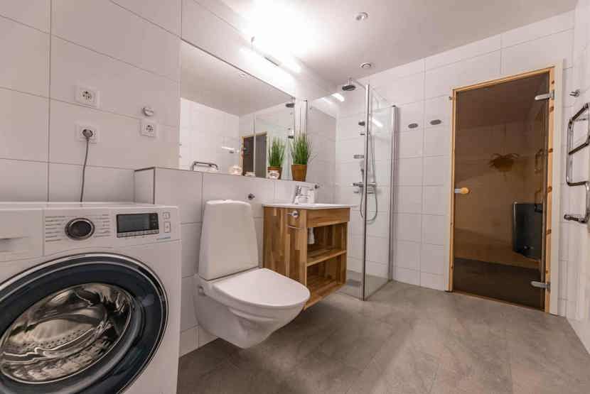 Opholdsstue med køkkenafdeling. TV, tørreskab, vaskemaskine, rum til skiudstyr.