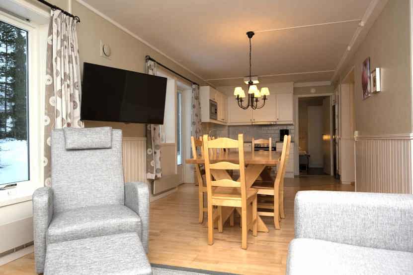 Opholdsstue med køkkenafdeling. TV, tørreskab, rum til skiudstyr.