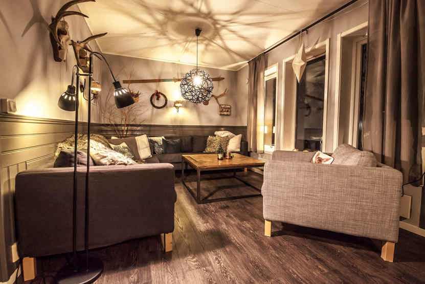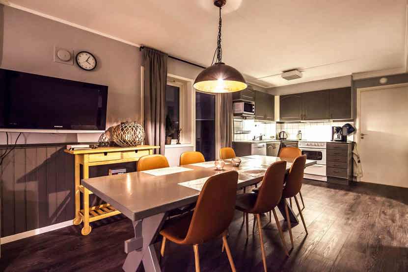 Opholdsstue med køkkenafdeling. TV, tørreskab, rum til skiudstyr.