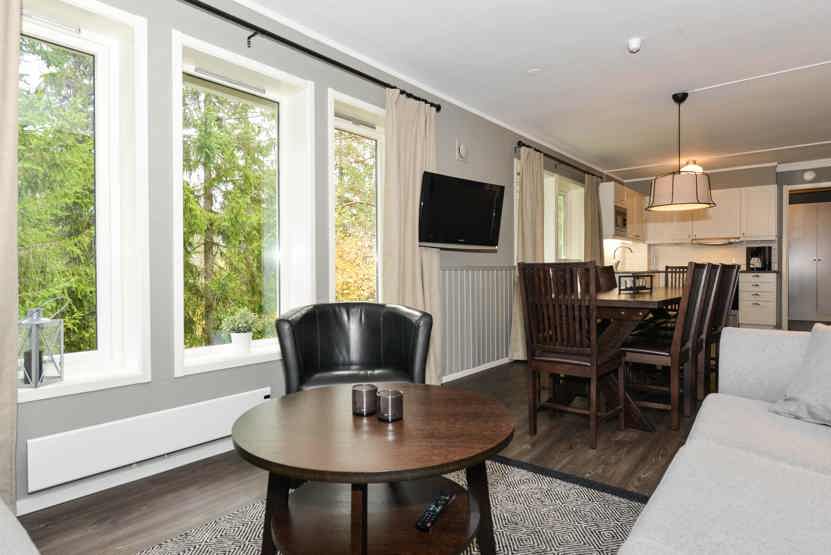 Opholdsstue med køkkenafdeling. TV, tørreskab, rum til skiudstyr.