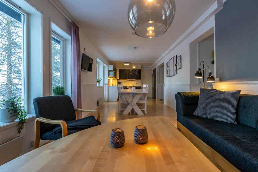 Opholdsstue med køkkenafdeling. TV, tørreskab, rum til skiudstyr.