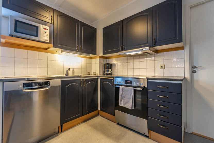 Køkkenet indeholder: elkomfur med ovn, køleskab, frys, microovn, opvaskemaskine.