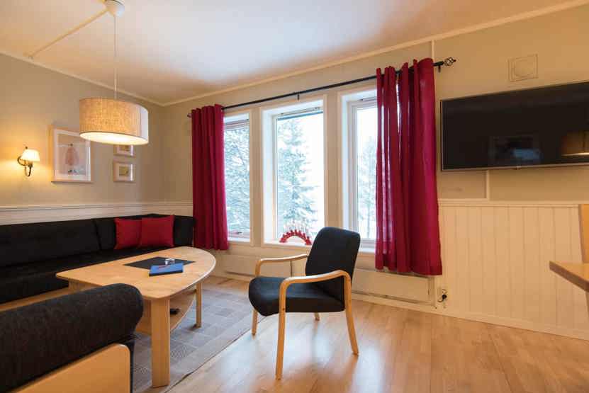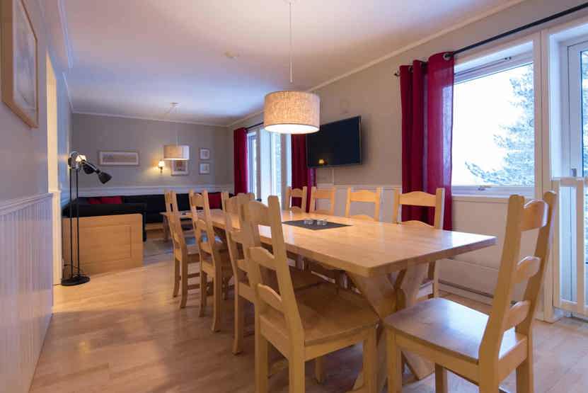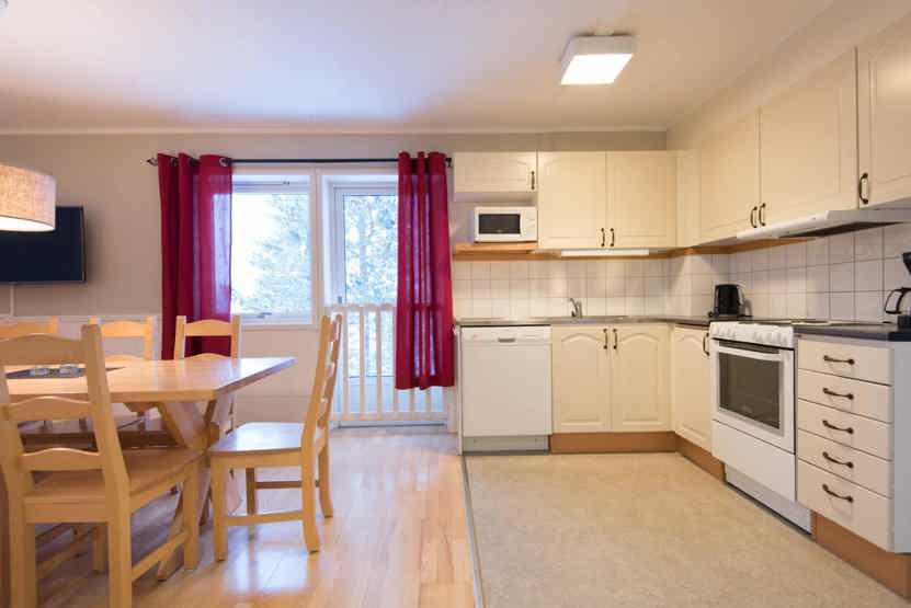 Opholdsstue med køkkenafdeling. TV, tørreskab, rum til skiudstyr.