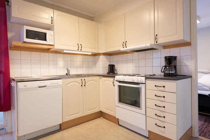 Køkkenet indeholder: elkomfur med ovn, køleskab, frys, microovn, opvaskemaskine.