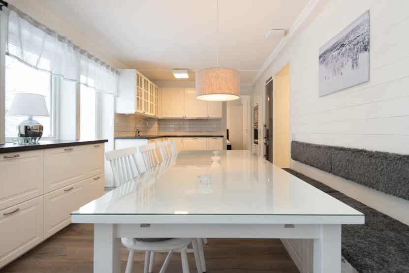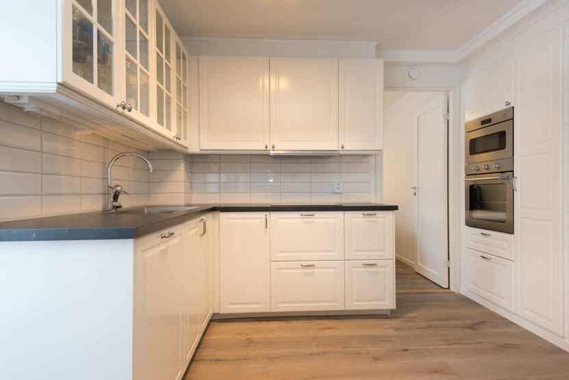 Køkkenet indeholder: elkomfur med ovn, køleskab, frys, microovn, opvaskemaskine.
