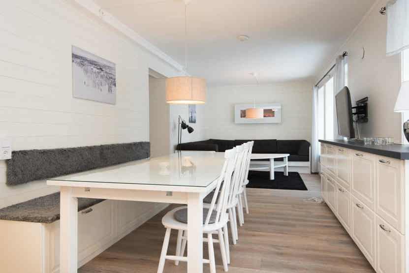 Opholdsstue med køkkenafdeling. TV, vaskemaskine, tørretumbler, tørreskab, rum til skiudstyr.