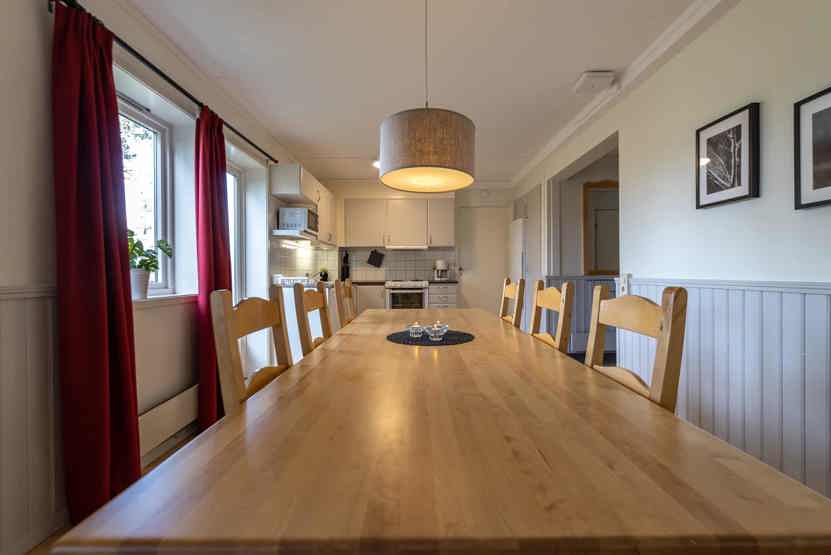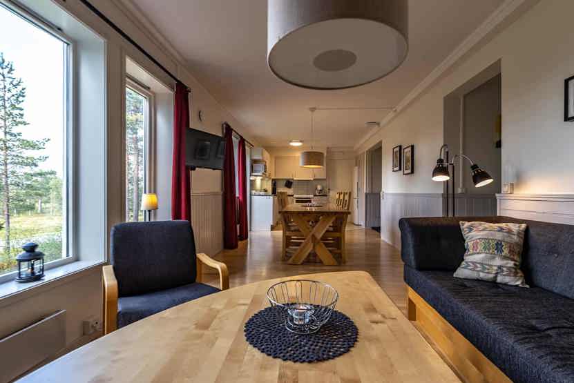 Opholdsstue med køkkenafdeling. TV, tørreskab, rum til skiudstyr.
