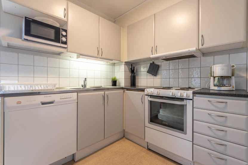 Køkkenet indeholder: elkomfur med ovn, køleskab, frys, microovn, opvaskemaskine.