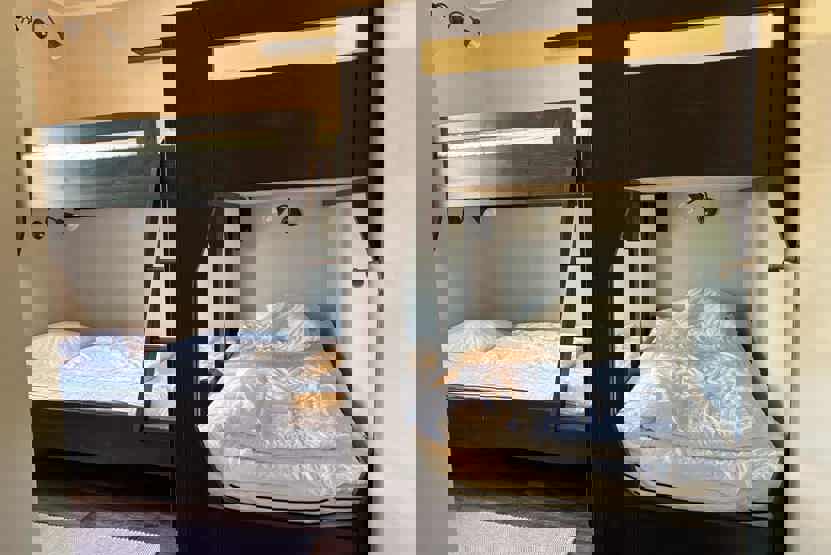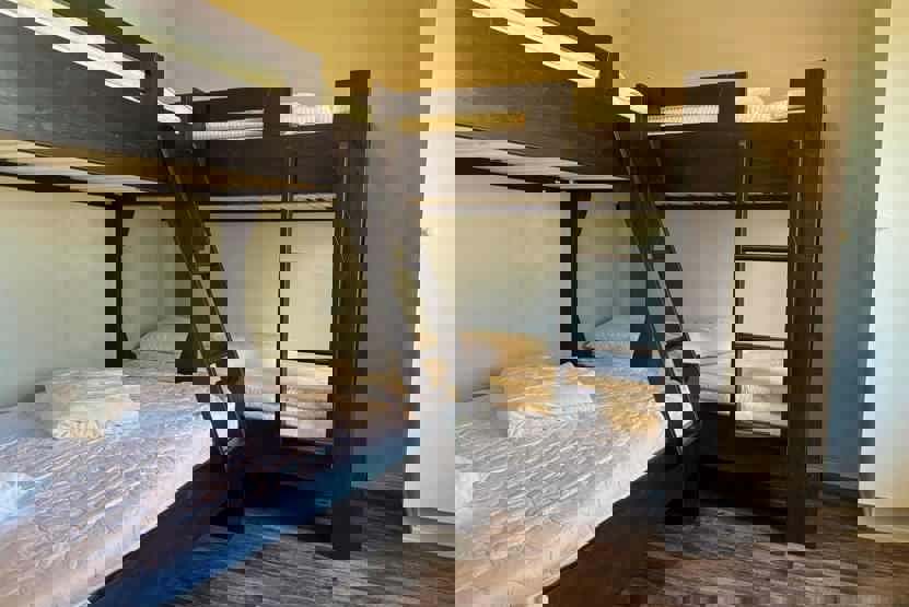 Soveværelse-1= 1 dobbeltseng. Soveværelse-2= 1 køyeseng med 120 cm bred underkøye og 90 cm bred overkøye, 1 køjeseng hvor både over og underkøje er 90 cm bred. Soveværelse-3= 1 køyeseng med 120 cm bred underkøye og 90 cm bred overkøye, 1 køjeseng hvor både over og underkøje er 90 cm bred.