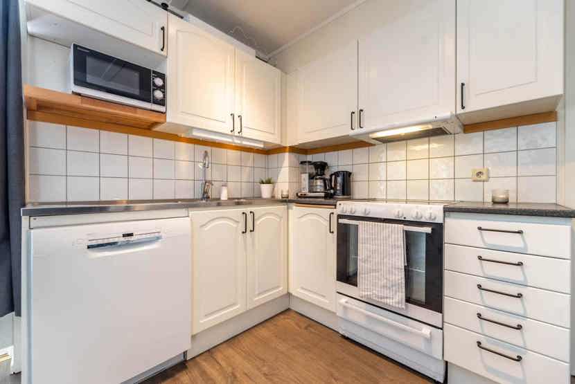 Køkkenet indeholder: elkomfur med ovn, køleskab, frys, microovn, opvaskemaskine.
