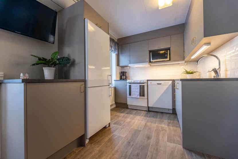 Køkkenet indeholder: elkomfur med ovn, køleskab, frys, microovn, opvaskemaskine.
